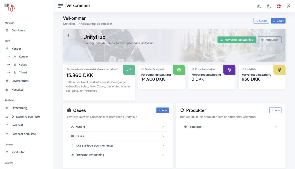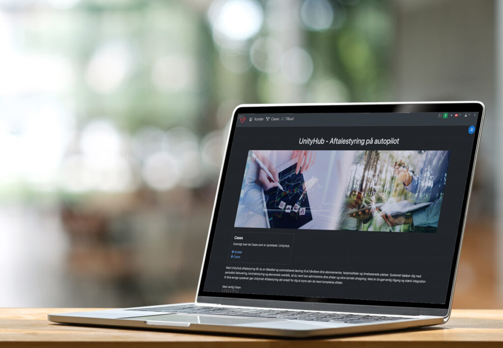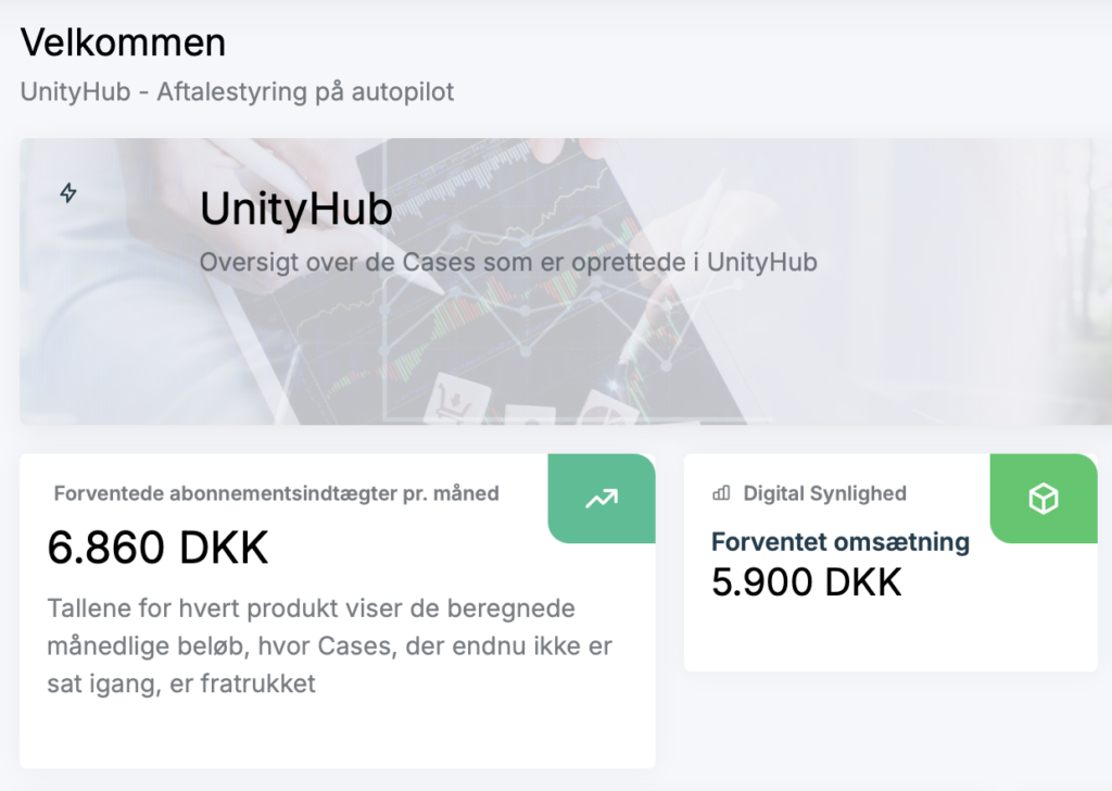 UnityHub er udviklet til virksomheder med gentagen indtjening, hvor aftaler og vilkår skal håndteres konsekvent over tid.